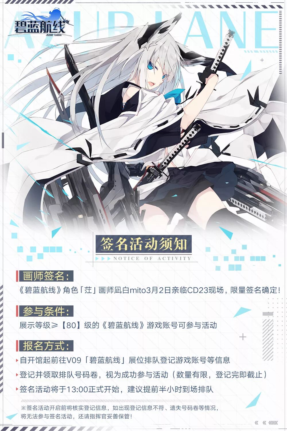 - 自3月2日开馆起前往「V09」碧蓝航线展位,展示等级≥【80】级的《碧蓝航线》游戏账号,可参与活动领取「签名会」排队号码券。
