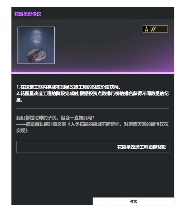{{纪念 |名称=花园星影像仪 |品质=4 |一级分类=活动纪念 |二级分类=[[文件:A-.png|100px|right]] |主要描述=1.在规定工期内完成花园星改造工程的对应阶段获得。<br> 2.花园星改造工程的阶段完成时,根据投资点数排行榜的排名获得不同数量的纪念。 |次要描述=我们都是地球的子民。但会一直如此吗?<br> ——摘录自轨道时事文章《人类拓展的疆域不断延伸,对蔚蓝天空的憧憬正在实现》 |来源=花园星改造工程贡献奖励 |故事=数千年前,我们的祖先了离开人类的摇篮,开始了他们在无边星海中的漂泊之旅。他们探索新世界,建造太空城,融入宇宙的浩瀚虚空。<br> <br> 即便经历了巨大的技术飞跃,取得了伟大的成就,人类始终被地球吸引。他们怀念坚实的土地、蔚蓝的天空、轻柔的风.… 太空站和城市的铬金属墙壁令人感到压抑和窒息。然而,地球已无力容纳新的居民。<br> <br> 因此,在人类对故土的渴望变得难以忍受时,安东塔斯的领袖们决定改造花园星的表面,为后人们重新铺就回归大地的道路。 }}